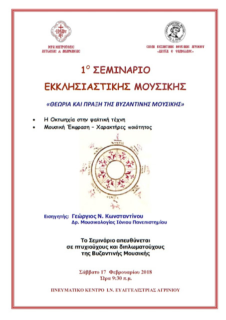 σεμινάριο με τον κ. Γεώργιο Κωνσταντίνου Φεβρουαρίου 15, 2018 Λήψη συνδέσμου Facebook X Pinterest Ηλεκτρονικό ταχυδρομείο Άλλες εφαρμογές Σάββατο, 17 Φεβ. 2018 ώρα 9:30 π.μ. στο Πνευματικό Κέντρο Ι.Ν. Ευαγγελιστρίας στο Αγρίνιο. Εισηγητής: Γεὠργιος Ν. Κωνσταντίνου, διδάκτωρ μουσικολογίας - χοράρχης. Μόνο για πτυχιούχους και διπλωματούχους Βυζαντινής Μουσικής. Σχόλια